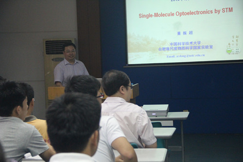 董老师近十几年来重点研究分子尺度上的光子态调控、单分子电致发光、以及纳米等离激元学。报告中,董老师介绍了自主建立和发展的高分辨扫描隧道显微镜与高灵敏单光子检测相结合的联用技术,阐述了分子尺度的光子态调控的科学意义以及实现光子态调控的方法,应用这些技术和方法,董老师小组首次在分子尺度上实现并检测到源于HOMO-LUMO辐射跃迁的分子荧光,发现了新奇的无振动驰豫热荧光、“能量禁阻”的上转换电致发光和“彩色”频谱调控现象,将单分子光学拉曼成像的分辨率提高到创纪录的亚纳米尺度,获得了同行的高度评价,部分结果发表在近期的NATURE期刊上。报告结束后,董老师和师生进行了深入交流。