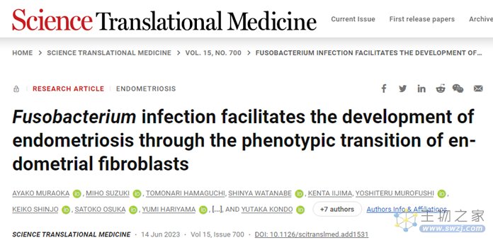 近日,日本名古屋大学研究团队在Science Translational Medicine发表题为“Fusobacterium infection facilitates the development of endometriosis through the phenotypic transition of endometrial fibroblasts”的研究成果,发现了子宫内膜异位症(EMs)的潜在致病因素:梭杆菌感染,杆菌属感染会促进子宫内膜异位症的发展,抗生素治疗则能有效减少实验动物病灶。结合人类研究中的数据,64%子宫内膜异位症患者都存在梭杆菌属感染的情况,这提示或许抗生素治疗能够成为缓解她们痛苦的一剂良方。