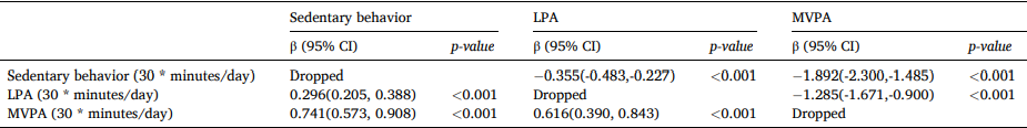 最后,研究人员还分析了用低强度运动、中高强度运动代替久坐行为对表型年龄的影响,每天用30分钟低强度运动、中高强度运动替代久坐行为,分别与表型年龄降低0.4、1.9年相关。相反,用久坐行为代替运动,会加速表型年龄衰老。