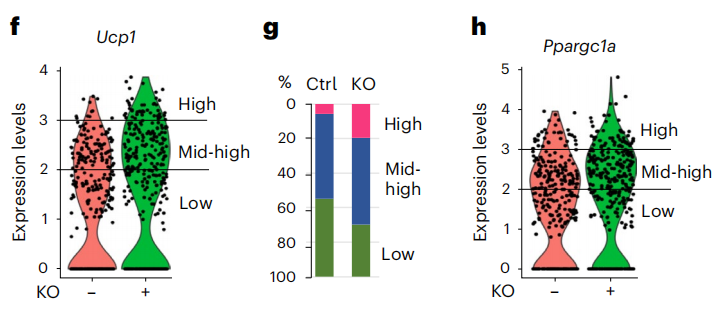 基于基因表达特征,研究者们发现,JunB缺失能够诱导低产热棕色脂肪细胞向高产热棕色脂肪细胞的转化。与正常表达JunB的棕色脂肪相比,JunB耗竭的棕色脂肪中的高产热脂肪细胞占比从5.8%增加到19.5%,低产热脂肪细胞占比从45.3%减少到30.0%,处于过渡态的中等产热脂肪细胞占比几乎没有差异。