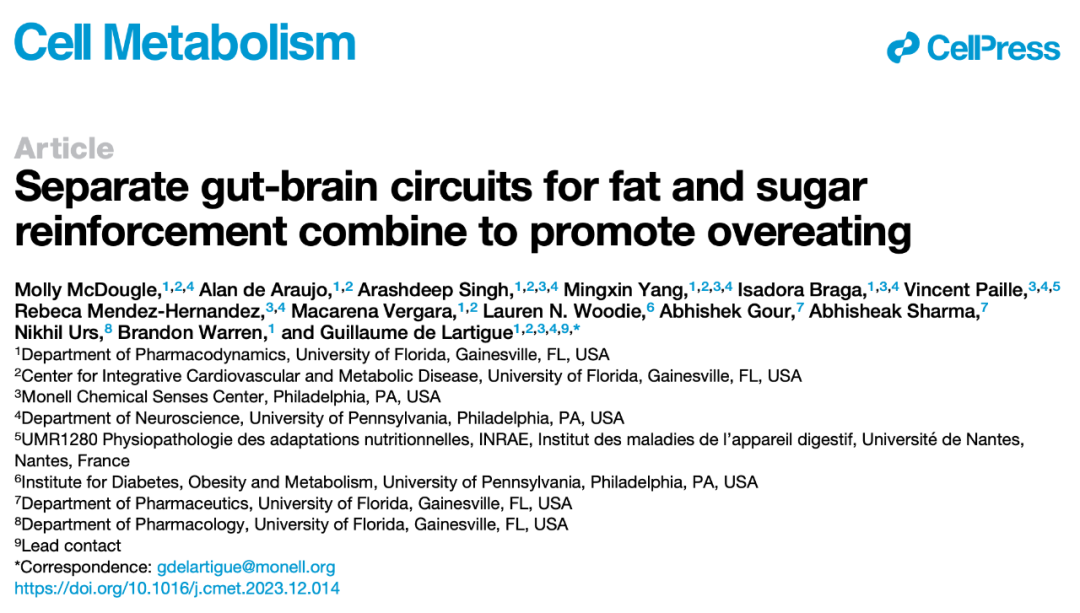 2024-01-23 15:06:14 来源:生物世界佛罗里达大学的研究人员在 Cell Metabolism 期刊发表了题为:Separate gut-brain circuits for fat and sugar reinforcement combine to promote overeating 的研究论文。