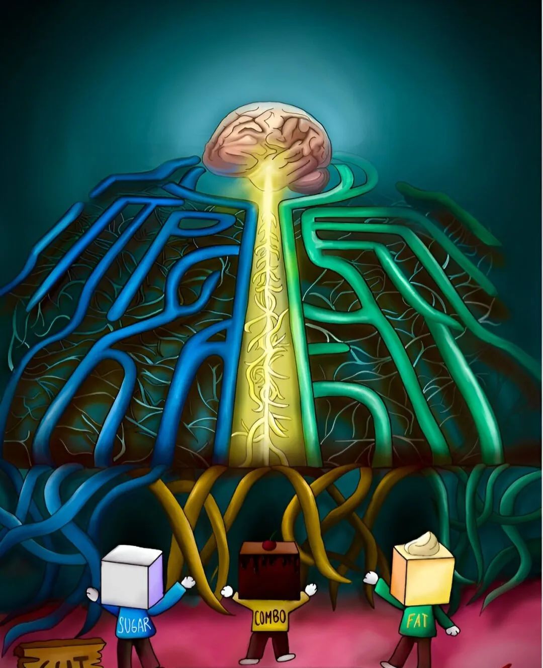 在研究团队提供的这幅漫画中,糖、脂肪以及二者组合(巧克力)在肠-脑迷宫中穿行。蓝色路径代表糖路线,绿色路径代表脂肪路线,黄色路径代表脂肪和糖的综合影响。每条路径都通向大脑,但糖和脂肪组合的路径具有更大的影响,触发奖赏回路中多巴胺的释放,强调了脂肪-糖组合对神经反应的协同作用。