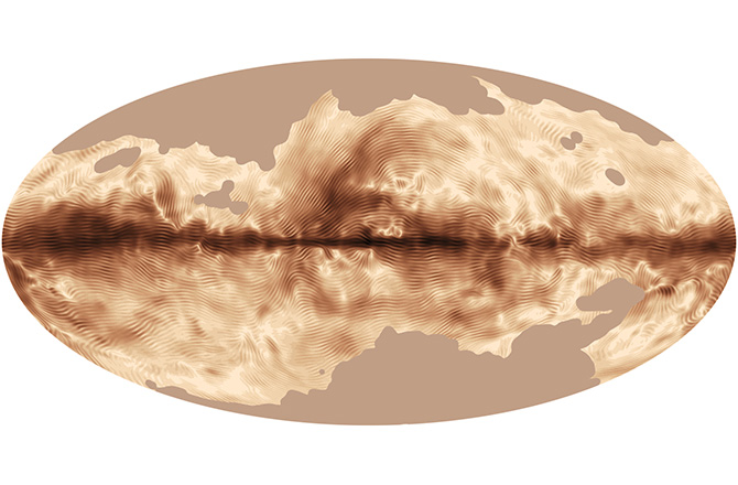 图中的波浪线是由整个银河系的复杂磁域形成的,星际尘埃螺旋排列,并因此形成光的偏振网。较暗的区域对应有更强的偏振场,并且只有一条暗线贯穿银河系中心平面最密集的地方。星际尘埃发出的偏振光呈旋转线性模式,这点不同于人类指纹的循环和旋涡模式。