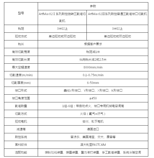 ArtMax02Ⅰ系列、ArtMax02Ⅱ系列在焊接的结构生产中常见的焊接坡口有带钝变或不带钝边的V、Y、X、K型坡口。设计有3把割炬的WTTⅡ系列数控直线三割炬切割机可以将坡口同时一次切割而成,切割效率高、精度好、技能要求高。主要用于直线V、X、Y、K型等坡口切割,坡口角度可调范围为0—45度。其结构是在移动体上安装三组割炬,同时可根据用户的工艺要求增加预热割炬和大角度坡口割炬,在切割时分别调整割炬的相互位置和角度,再配上三割炬在自动调高装置,能实现直线边切割坡口功能或大弧线边切割坡口的功能,可自动割出满意的坡口。WTTⅡ系列数控直线火焰三割炬切割机主要应用于造船,化工等待业拼板前的切割。WTTⅠ系列是在WTTⅡ系列的基础上转变而来的,WTTⅠ系列不但能切割能实现直线边切割坡口功能或大弧线边切割坡口的功能,而且能切割简单图形的坡口。