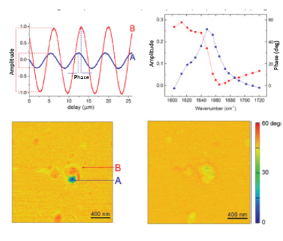 s-SNOM技术使用金属镀层的原子力(AFM)探针针尖代替传统光纤探针来增强样品的纳米尺度区域的散射,散射信号可以在远场被检测到。而这些散射信号携带了样品在金属探针针尖下纳米级区域的复杂光学性质。具体而言,这些散射光的信息包括光的振幅和相位,通过适当的模型,这些测量可以估算出针尖下样品纳米尺度区域材料的光学常数(n,k)。在某些情况下,光学相位与波长还提供了一个与同种材料常规吸收光谱近似的光谱信息。 瑞宇科技的散射式近场光学显微镜建立在基于具有领先地位的纳米光学表征工具原子力显微镜AFM的基础之上。s-SNOM设计具有无与伦比的性能,高度集成,全面自动化,使用灵活,为研究生产力和易用性设定了新的标准。 瑞宇科技的散射式近场光学显微镜特别适用于硬质材料,特别是具有高反射率、高介电常数或强光学共振的材料。它与瑞宇科技的纳米红外光谱成像显微镜(NanoIR)配合使用,可以完成对所有物质纳米尺度的化学性质分析及探索。 瑞宇科技的散射式近场光学显微镜的分辨率仅由AFM针尖的曲率半径决定,与入射光源的波长无关,能够在可见、红外和太赫兹光谱范围内,提供最佳10nm空间分辨率的光谱和近场光学图像。 产品特点: ? 10nm空间分辨率近场成像和光谱; ? ? 专利的快速成像和采谱技术,10倍于传统的空间光谱成像; ? ? 专利背景压制技术和高效光学信号收集技术,确保在10nm空间分辨率下仍然保持极高的信噪比; ? ? 预先校准光路,操作极其简便; ? ? 模块化设计,可拓展性强; 应用: 由于瑞宇科技的散射式近场光学显微镜和光谱谱图的可靠性和可重复性,s-SNOM业已成为纳米光学领域热点研究方向的首选科研设备,广泛适用于各种无机物和有机物,如表面等离子体、纳米天线、2D材料(石墨烯,BN),纳米结构,半导体,绝缘体,生命科学,高分子材料等,在等离基元、纳米FTIR和太赫兹等众多研究方向得到许多重要科研成果。 ![]() 石墨烯等离子体的s-SNOM相位和振幅图像(上—相位图像三维视图;左—相位和SPP驻波线横截面;右—s-SNOM振幅图)